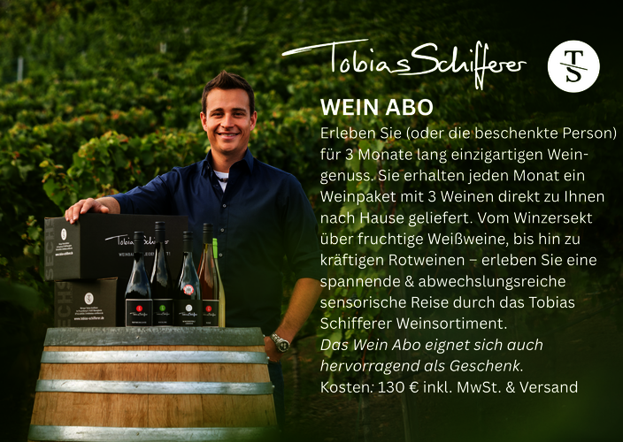 Sehr gerne dürfen Sie alle Tobias Schifferer Weine online oder telefonisch bei mir bestellen. Der Wein kann ab Hof abgeholt werden oder per Post (zzgl. Versandkosten) versandt werden. Vielen Dank für Ihre Bestellung.